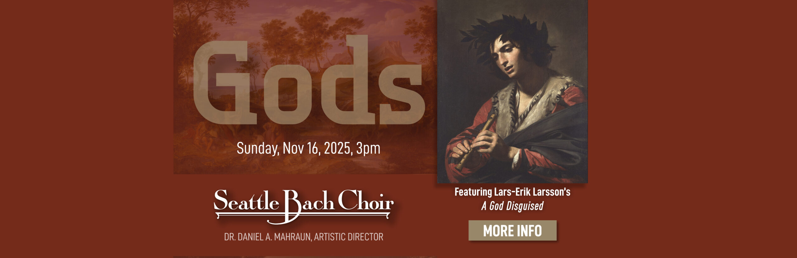 Beloved in Sweden, but seldom heard in the US, Lars-Erik Larsson’s A God Disguised comprises the centerpiece of this program. The cantata tells the story of an episode in the life of the god Apollo, when for a short time he lived on earth as a shepherd. Another shepherd-god is the focus of Vaughan Williams’ dramatic Five Mystical Songs, also heard on this program.